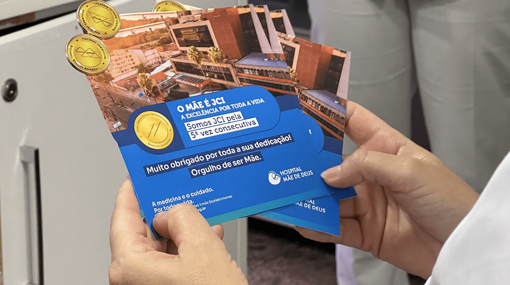 Para celebrar a conquista do selo da Joint Comission International (JCI), cada colaborador do Hospital Mãe de Deus recebeu um pin celebrativo.