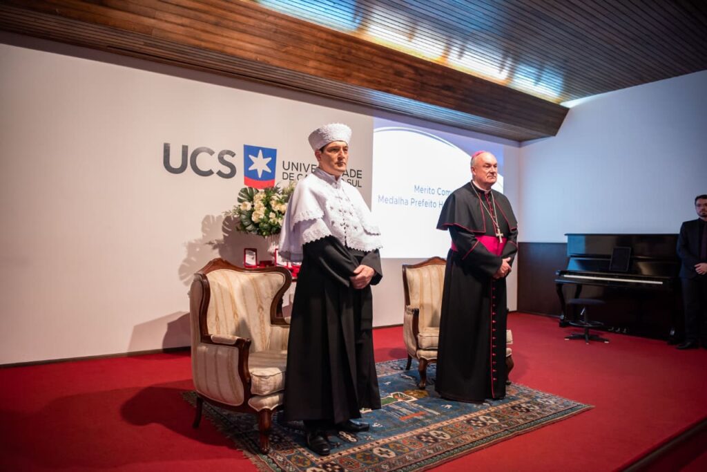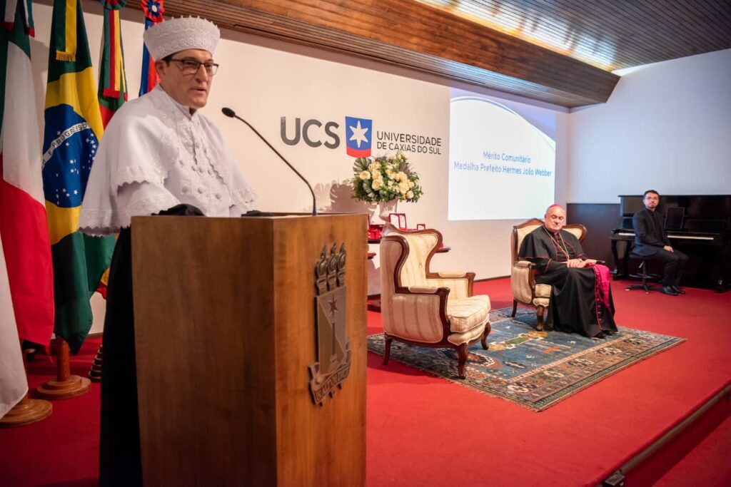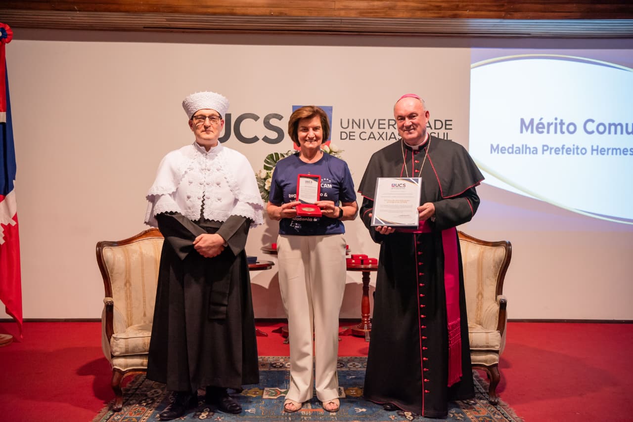 A honraria foi entregue pelo reitor da Universidade de Caxias do Sul, professor Gelson Leonardo Rech, e pelo bispo de Caxias do Sul, Dom José Gislon, presidente da Fundação Universidade de Caxias do Sul (UCS). Conforme divulgado pela própria UCS, Dom José assumiu a presidência da fundação mantenedora da universidade em 2023 (UCS, 2023). Esse contexto reforça o caráter institucional e comunitário da homenagem, alinhado à história de contribuição social que marca o CAM desde sua criação.