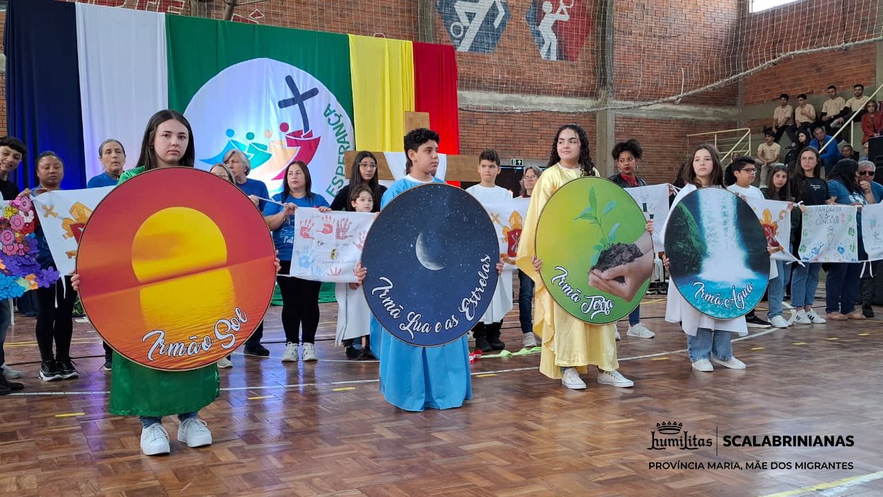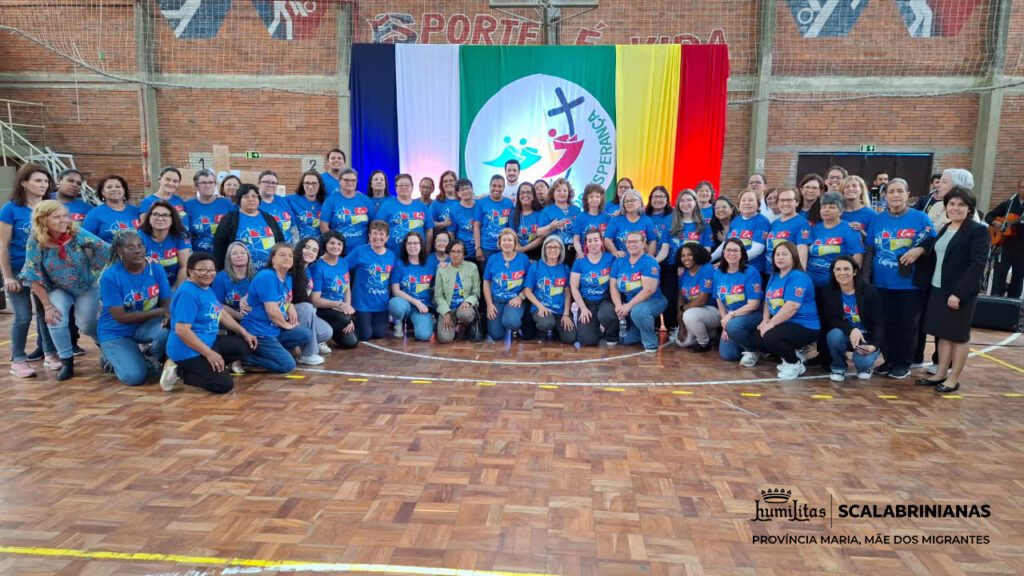 A acolhida foi conduzida por lideranças diocesanas, entre elas a Ir. Renata Biasibetti, Missionária Scalabriniana e coordenadora de catequese da Diocese. Entre os participantes, estiveram também as Irmãs Scalabrinianas Claudete Lodi Rissini, coordenadora do Sóciopastoral da PMMM, e Maria do Rosário Onzi, cuja presença enriqueceu o encontro. Como gesto simbólico, cada paróquia apresentou um retalho de tecido em formato de bandeira, confeccionado previamente para expressar sua trajetória e identidade pastoral. Unidos, esses retalhos formaram uma grande tenda, constituindo um mosaico de histórias e esperança — símbolo da unidade e da diversidade que caracterizam a vida da Igreja diocesana.