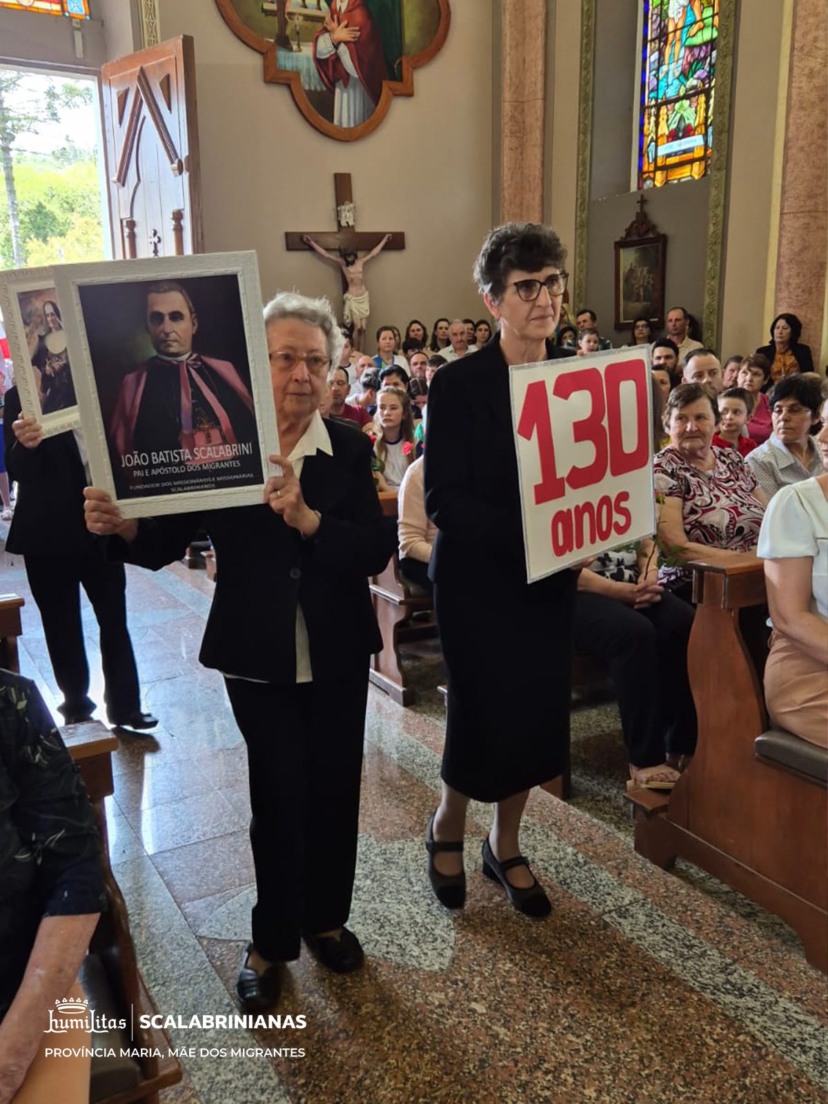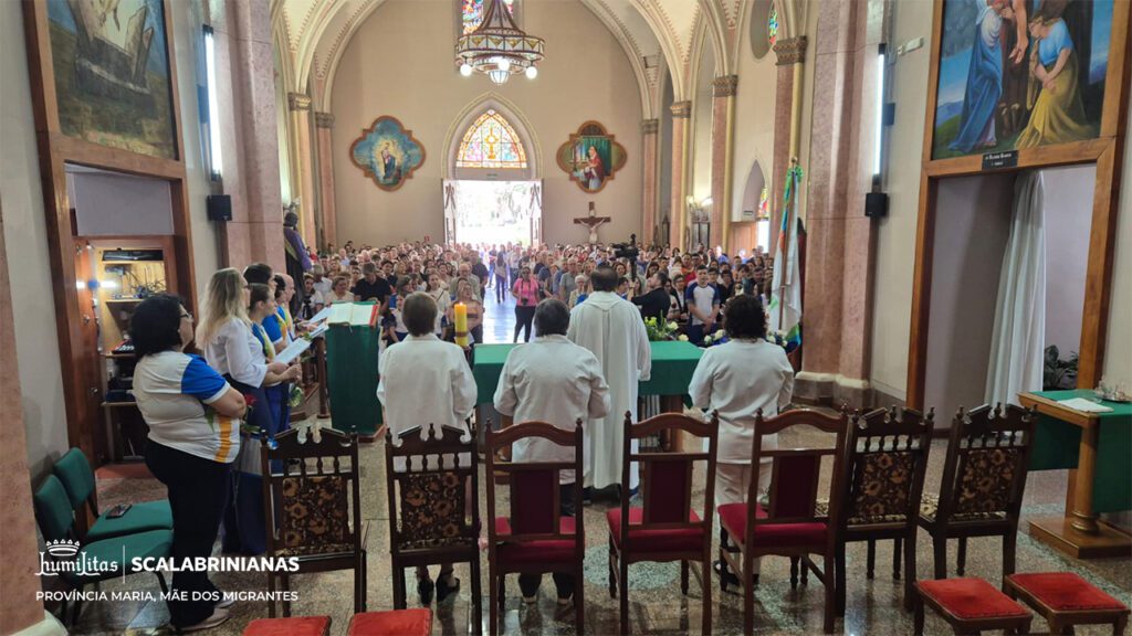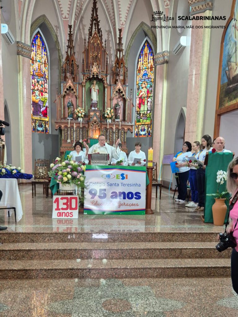 A missa foi iniciada com a entrada dos símbolos que representam a história do colégio: o número 130 representando os 130 anos da Congregação, celebrados em 2025, imagens de São Scalabrini, Madre Assunta e Pe. Marchetti, as bandeiras dos 27 países onde as Scalabrinianas estão presentes, o número 95, a Bandeira do Colégio, Pe. Hermínio Catelli, Imagem de Santa Teresinha e alunos com alunos com rosas.