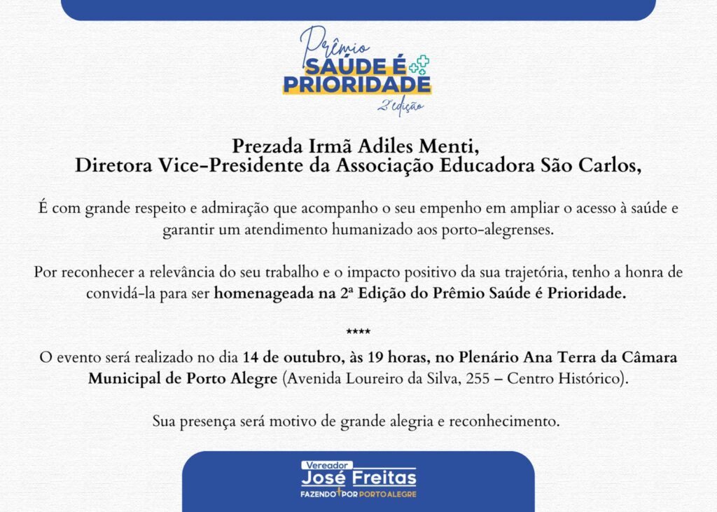 A homenagem reconhece o empenho da Ir. Adiles em ampliar o acesso à saúde e garantir atendimento humanizado aos cidadãos de Porto Alegre, bem como o impacto positivo de sua trajetória. O evento homenageará 10 pessoas que fazem a diferença na saúde em Porto Alegre e acontecerá nesta terça-feira, 14, a partir das 19h, no Plenário Ana Terra da Câmara Municipal de Porto Alegre (Avenida Loureiro da Silva, 255 – Centro Histórico).